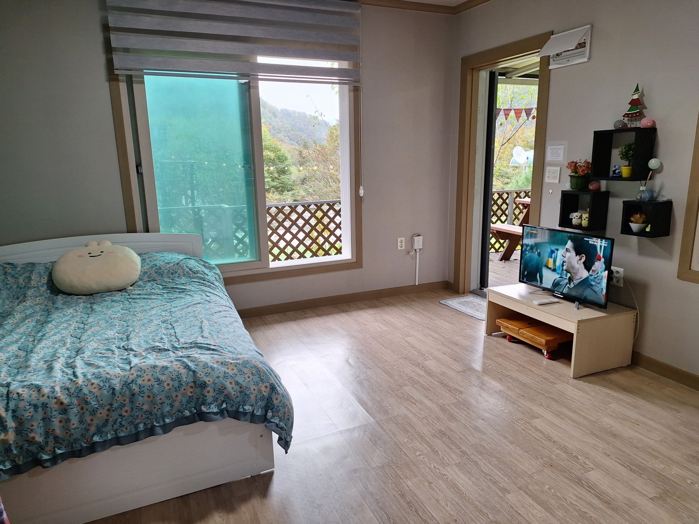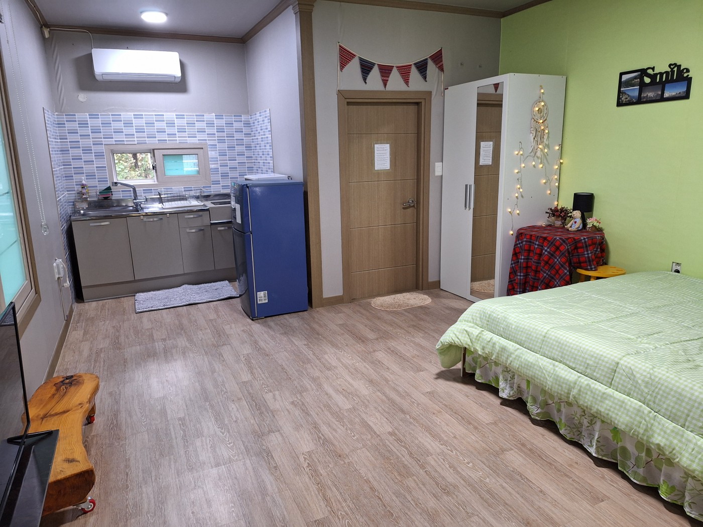 봄실(침대), 여름실(온돌) 펜션 객실 구조입니다.(원룸형 객실 겸 주방, 목욕탕)