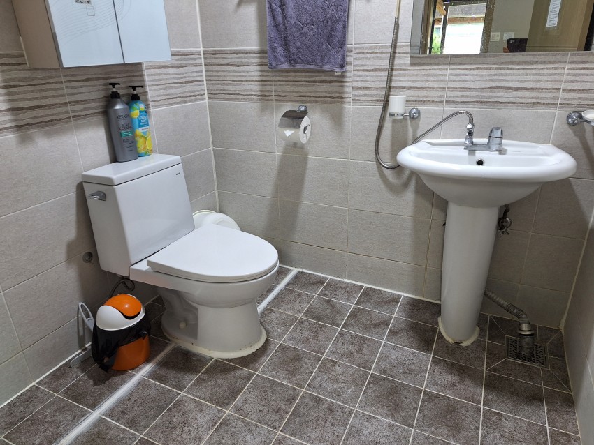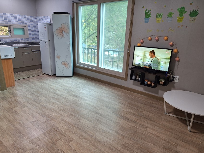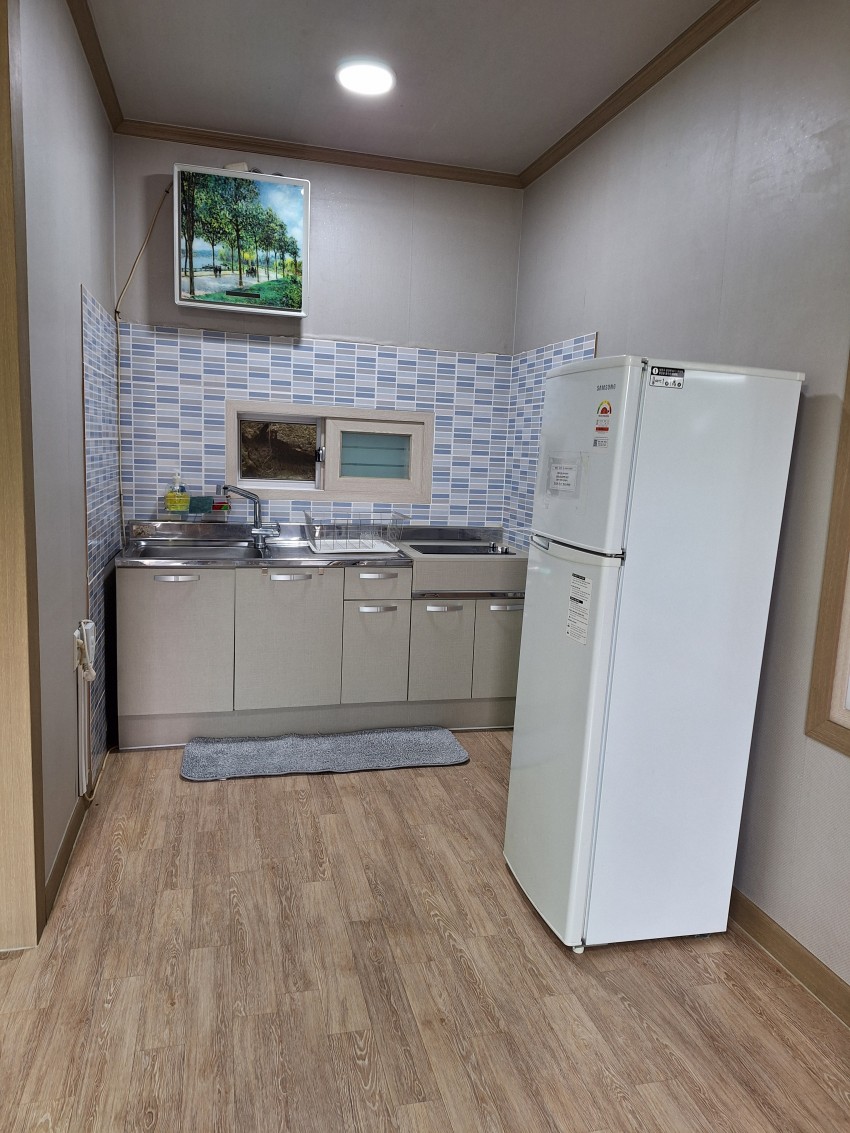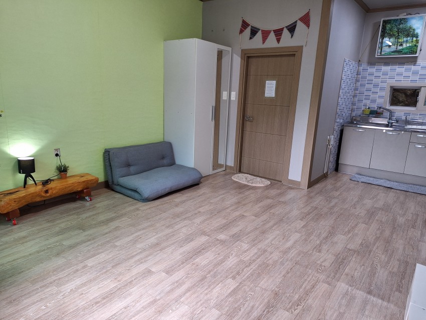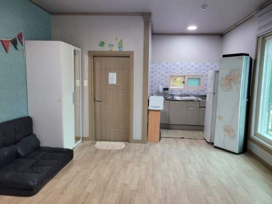 여름실(온돌룸) 펜션 객실 구조입니다.(원룸형 객실 겸 주방, 목욕탕)